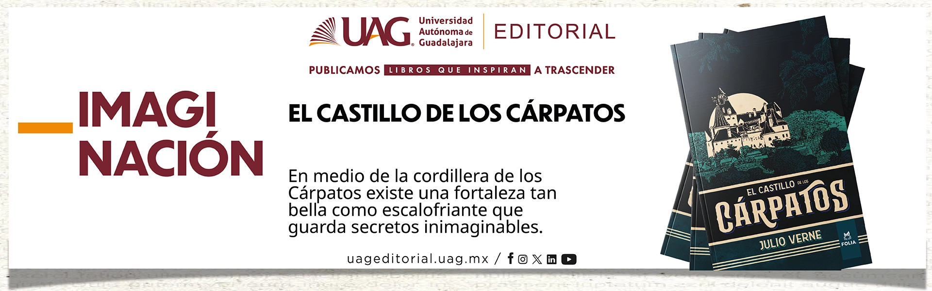La editorial Folia es una dependencia de la Universidad Autónoma de Guadalajara, A.C. (UAG), espacio de cultura, ciencia, educación, arte y tecnología al servicio de la humanidad. Bajo el auspicio de esta prestigiada institución educativa, Folia trasciende culturalmente hacia la sociedad a través de las publicaciones que selecciona y edita, las cuales procuran la formación integral de los lectores, quienes son considerados poseedores de inteligencia y voluntad.
